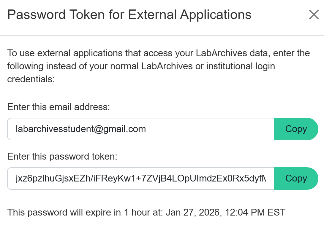 The Token for External Applications screen will appear. Click Copy to save the email or token to your clipboard. You can use the email address and token to login to the external application.