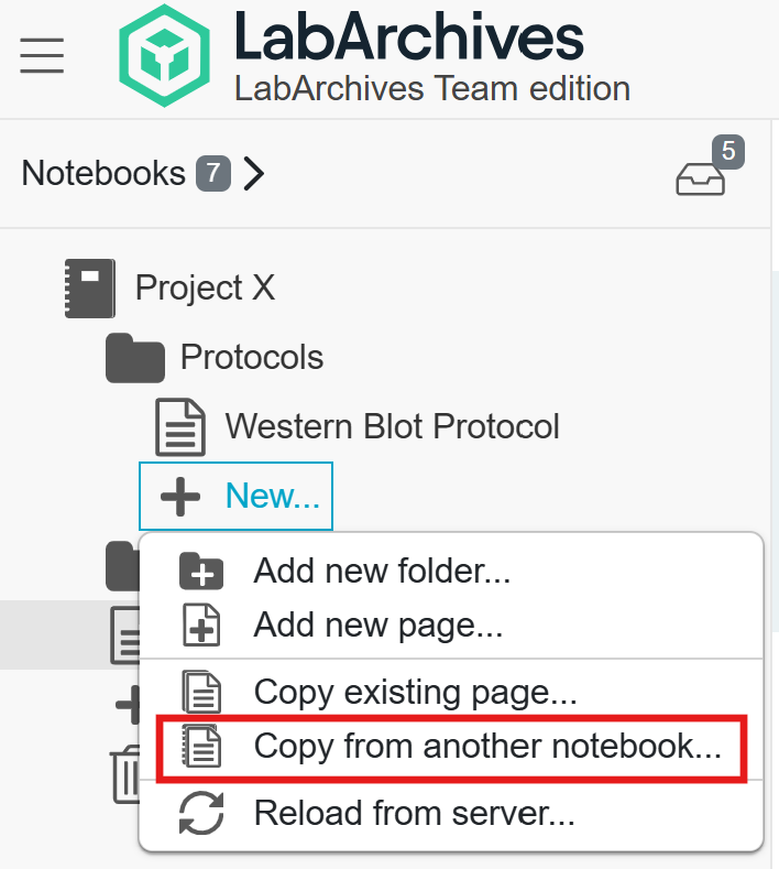 The Copy from Another Notebook feature lets you copy content from one notebook into another. Click +New, then select Copy from Another Notebook.