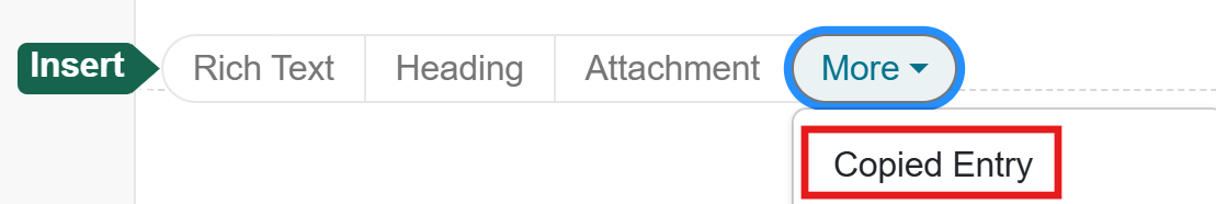 To paste the copied entry, go to the page where you want to place it. You can either click the +New button at the top right of the page and select Copied Entry, or hover over the page until the Insert Flag appears. Click the Insert Flag, then click More, and choose Copied Entry. The copied entry will be added to the selected location.