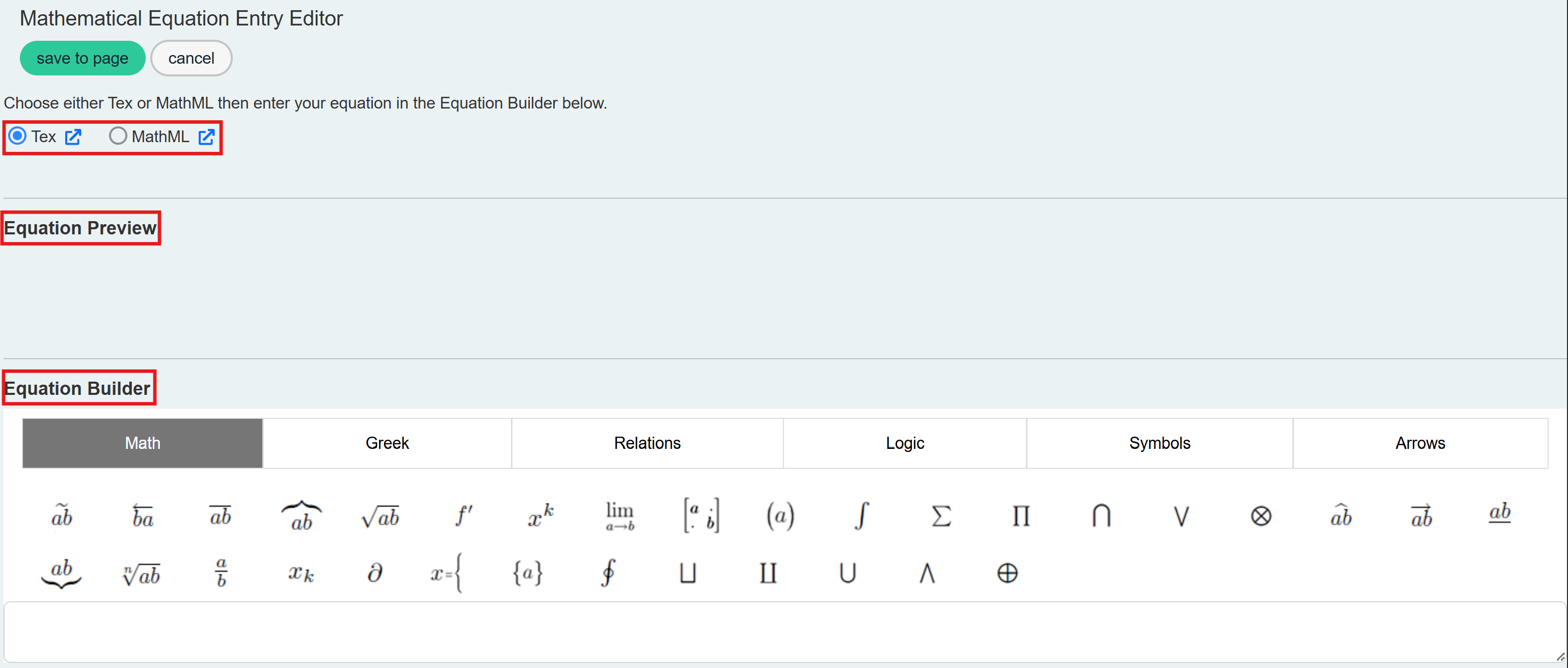 The builder panel offers a range of preformatted equation elements (e.g., symbols, operators, functions). Clicking on an element automatically adds the corresponding TeX code to the input field and updates the Equation Preview. The Equation Builder is not available with MathML. -