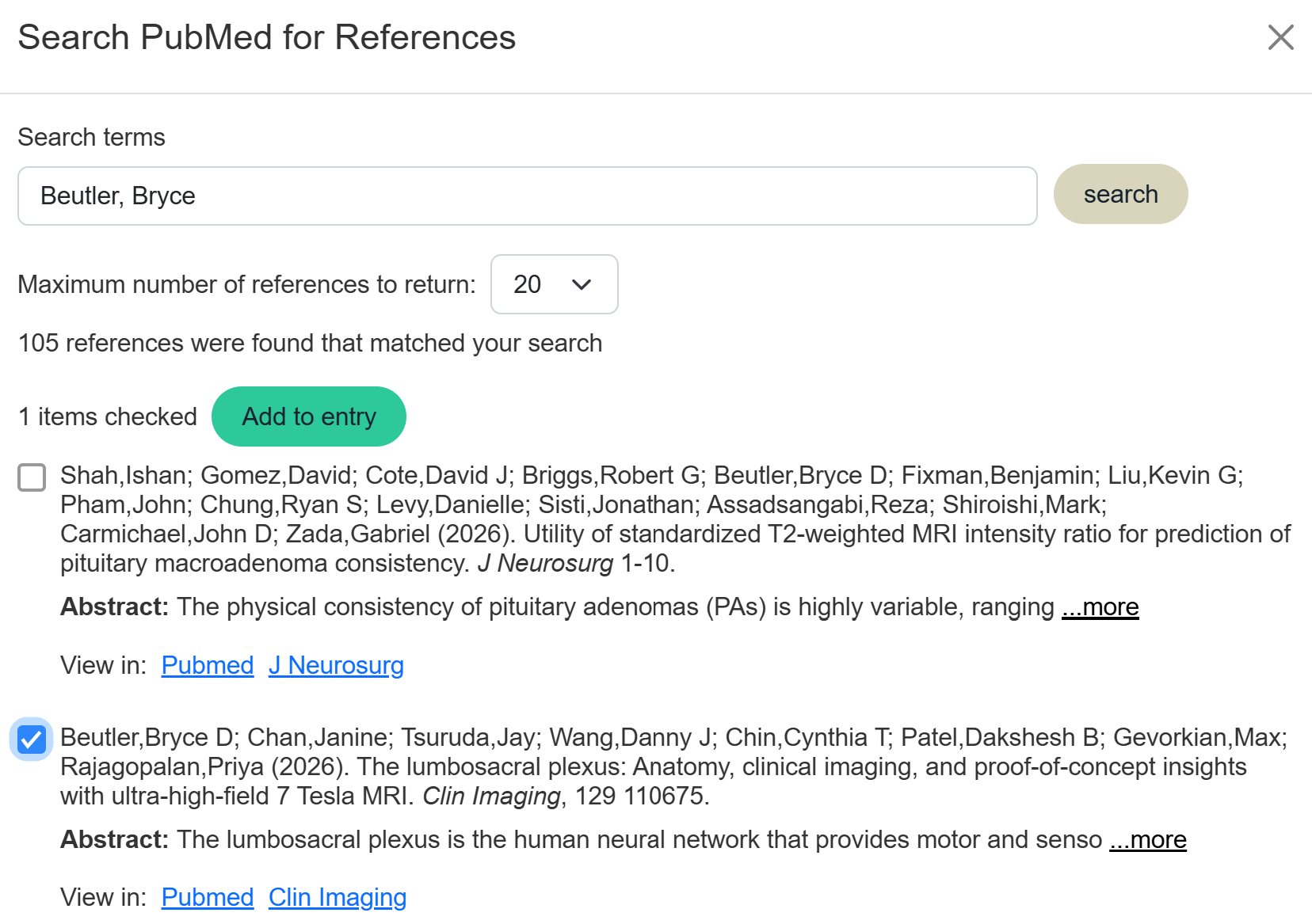 From the Search PubMed for References window, enter a search term such as a keyword, author name, or PubMed ID, then click Search. Matching references will appear below the search menu with an option to select the articles you want to reference. A link to view the article in PubMed and other sites may also be included. Click Add to Entry to insert the reference onto your notebook page.