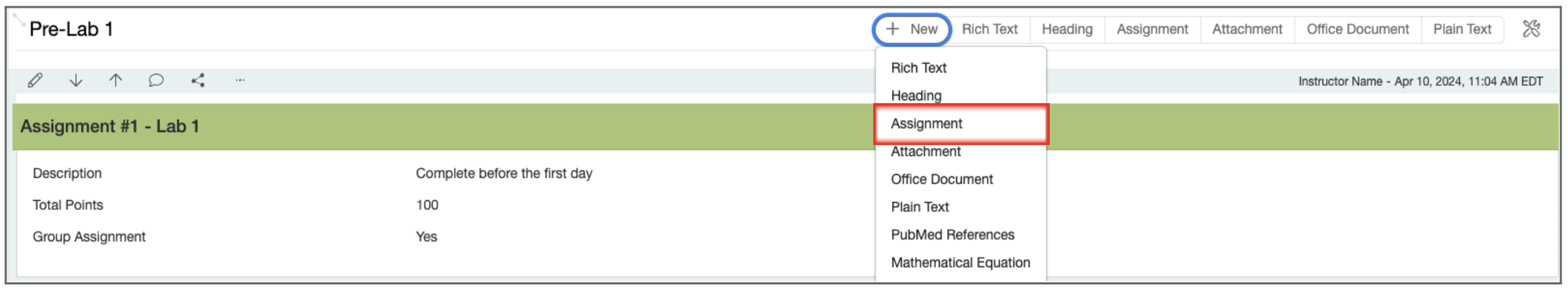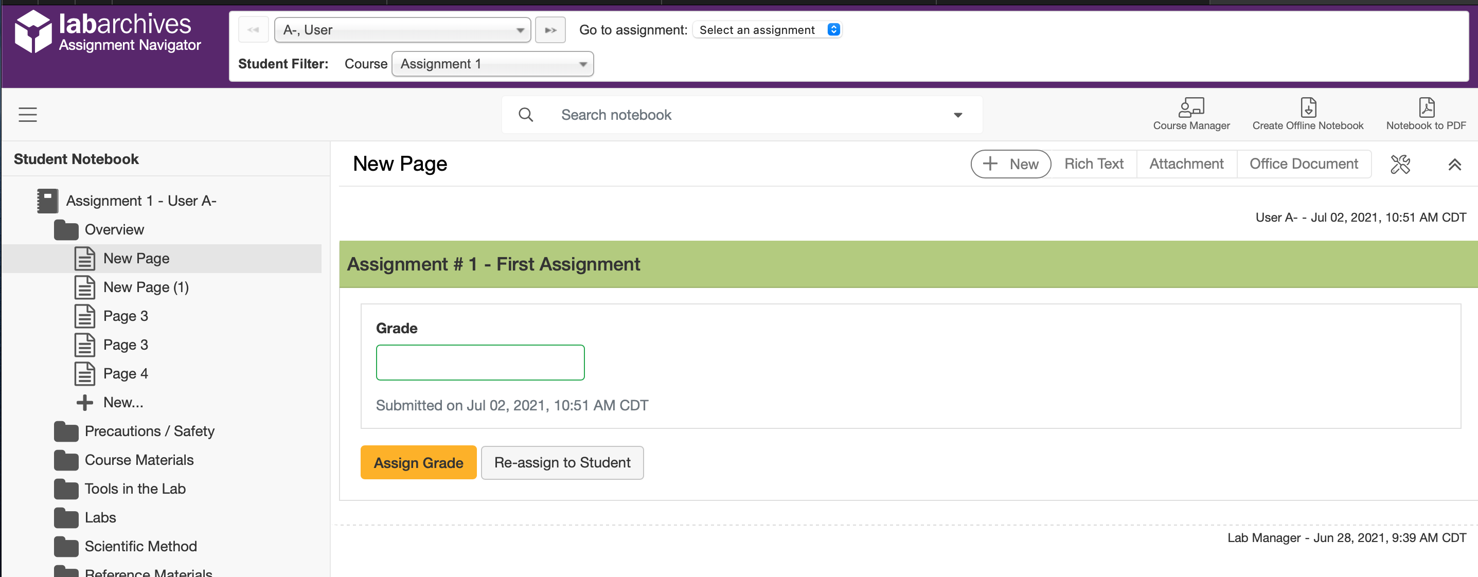 Use the LabArchives Assignment entry on pages that contain work your students need to submit.
