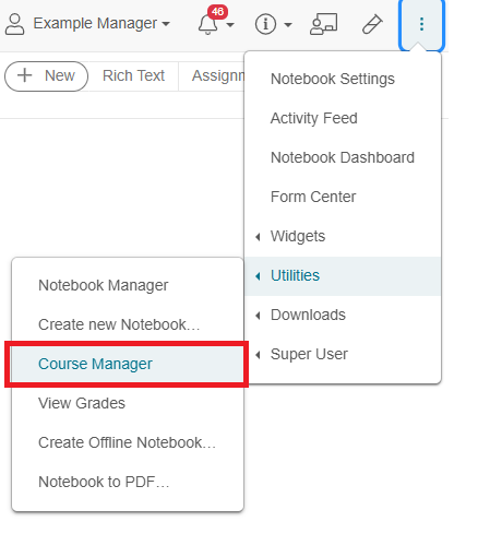 Click on the Course Manager icon to begin creating your course in LabArchives or through the triple dot menu, choose Utilities and Course Manager.