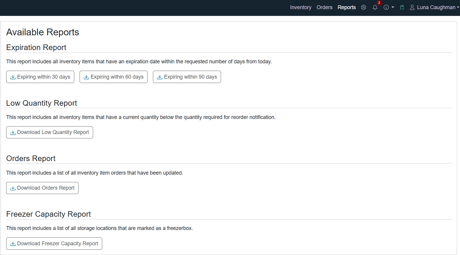 Through the Reports feature in the navigation bar, users with the Lab Manager role or Lab Management permissions can generate a variety of Inventory reports to track the current state of items in the Inventory Lab. Select the report to download the file and access it from your local downloads folder as an Excel file.