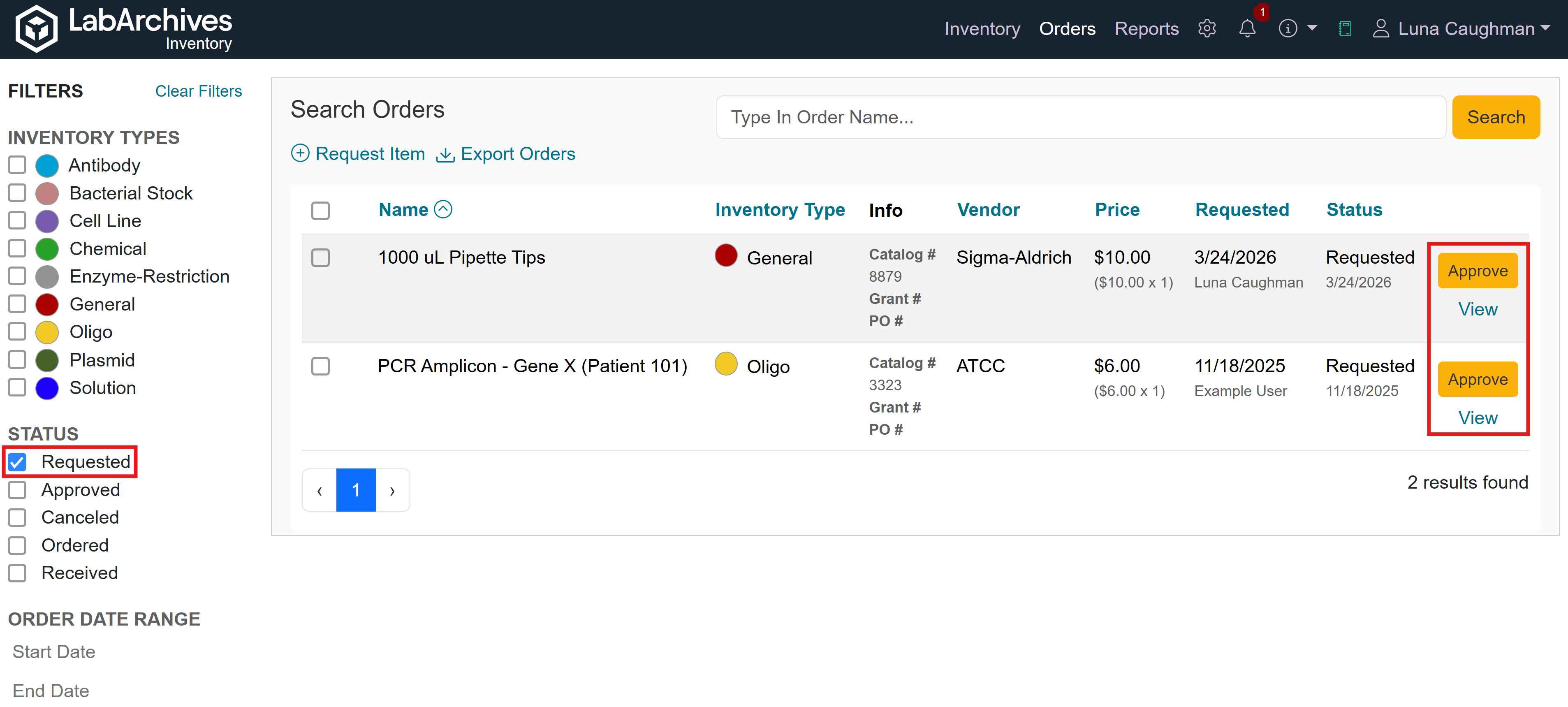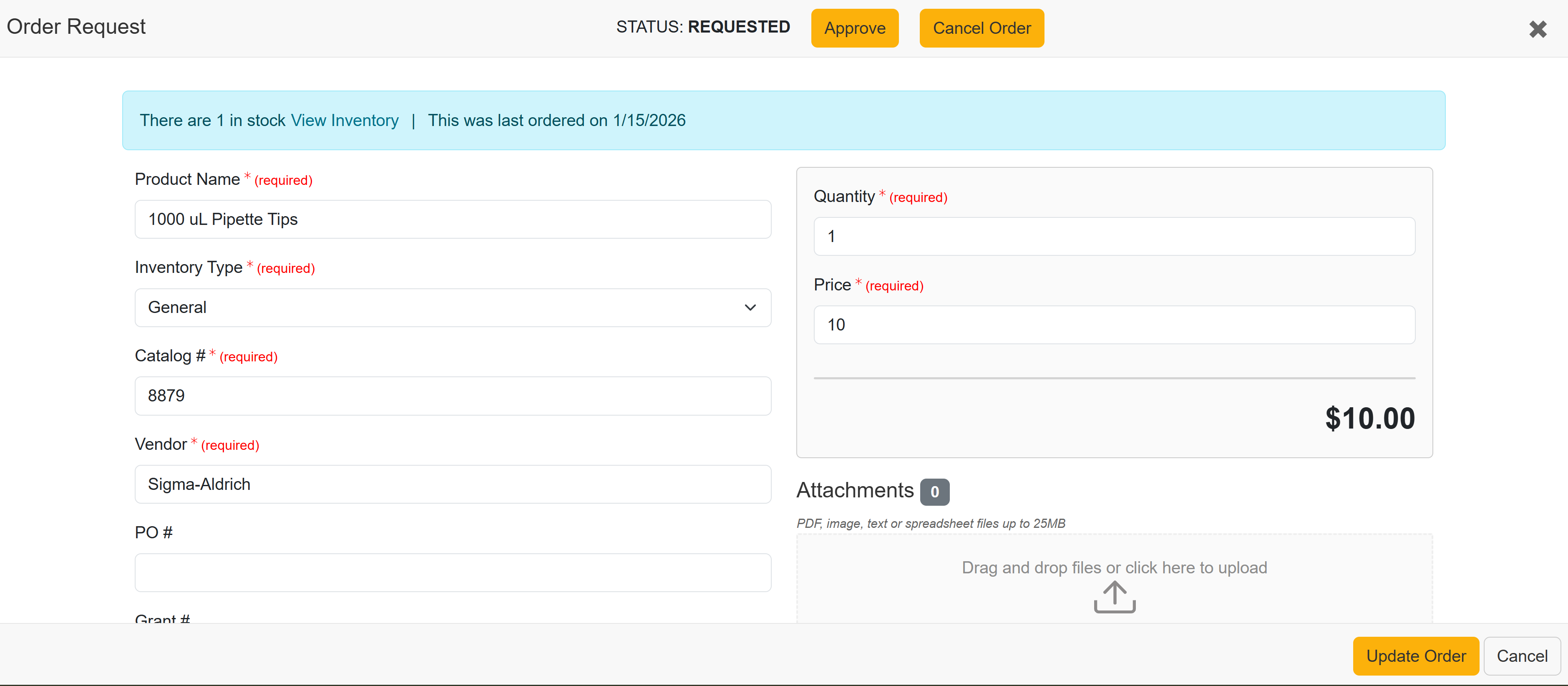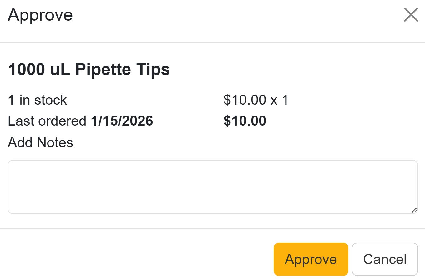 Note: If the Inventory Lab has enabled the option to Automatically Approve Orders below a certain price, Requested items below the threshold will be automatically approved and will skip the Requested status and jump to the Approved status. To learn more about Automatic Approval of Orders, visit Adjusting Lab Settings.