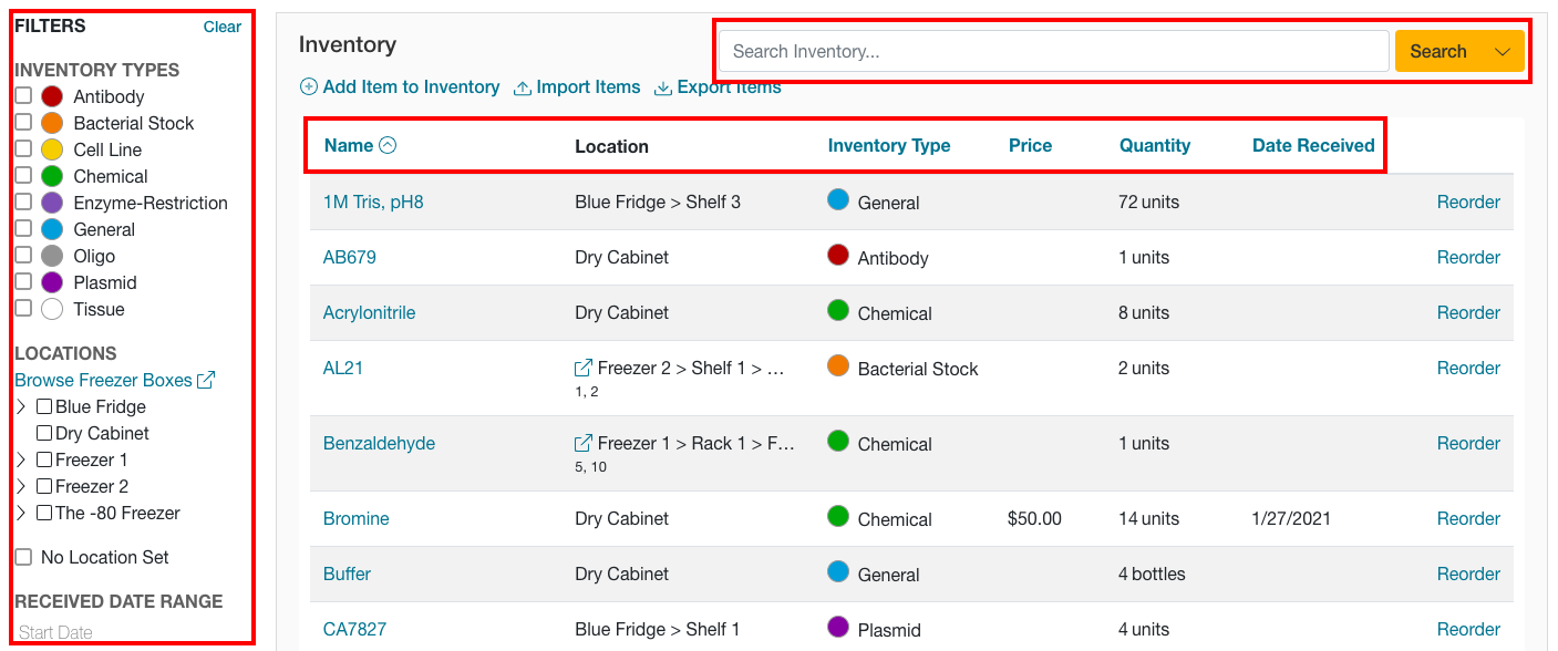 - From the main Inventory view, use the Filters to locate items by their Inventory Type, Location, Received Date Range, and Include your out of stock items.