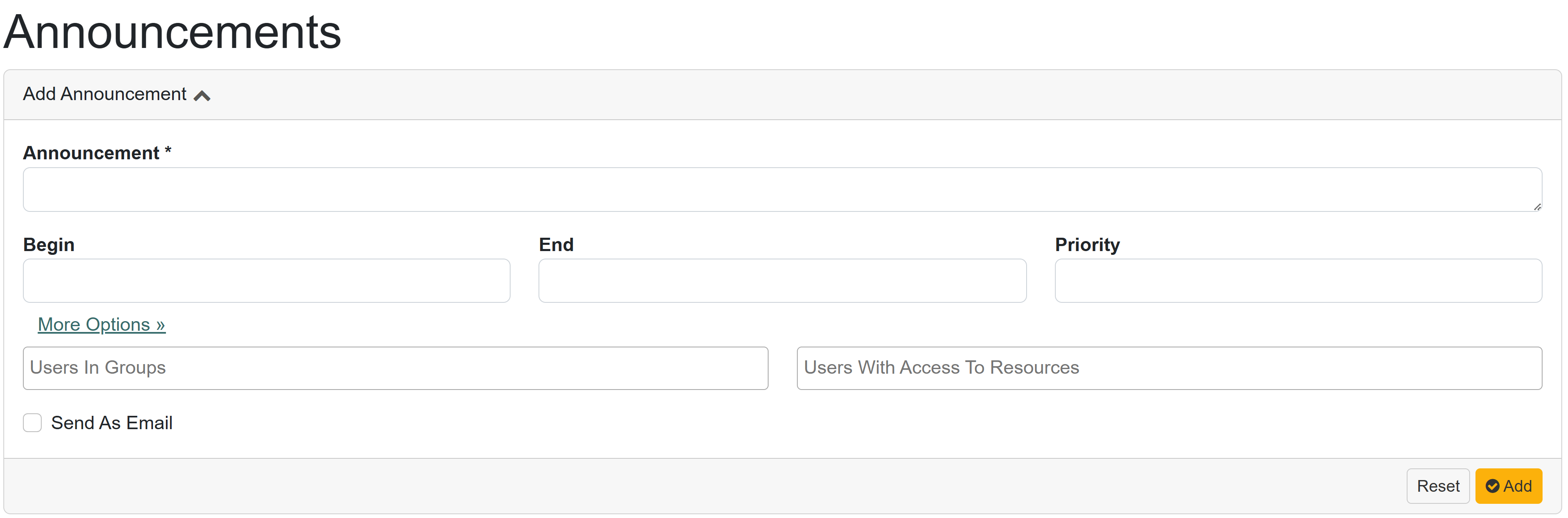 To create an Announcement, add the message in the Announcement field and set a begin and end date. Through More Options, you can limit the message to Users tied to a specific Group or Users that have access to specific Resources. Select the checkbox to Send as Email so that a copy of the Announcement is emailed. If there are multiple announcements to be posted at the same time, adjust the order that they appear through the Priority field.