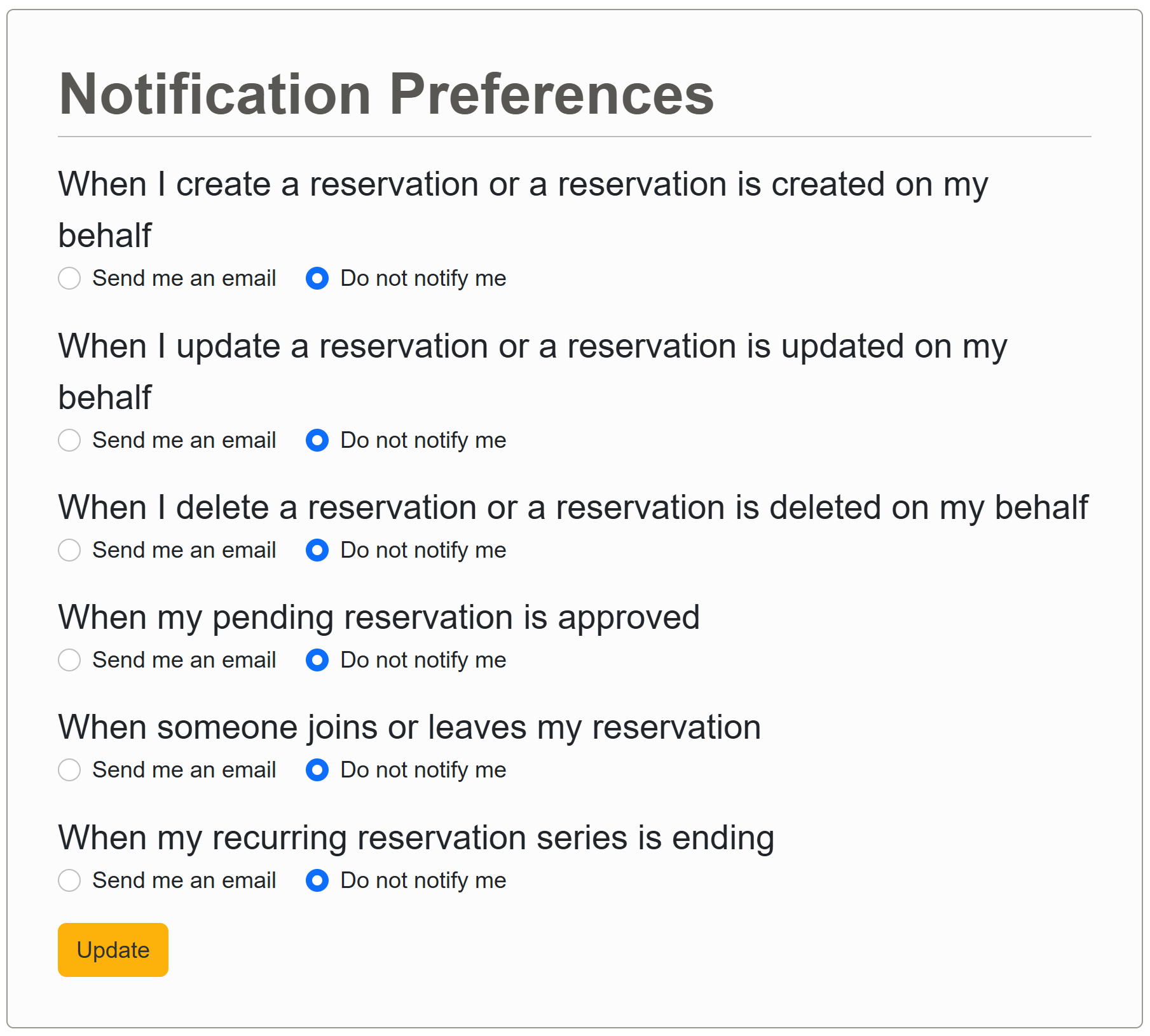 By default, all Notification Preferences for your reservations are disabled. Emails can be sent when reservations are created, updated, deleted, when a pending reservation is approved, when someone joins or leaves a reservation, or when a recurring reservation series is ending.