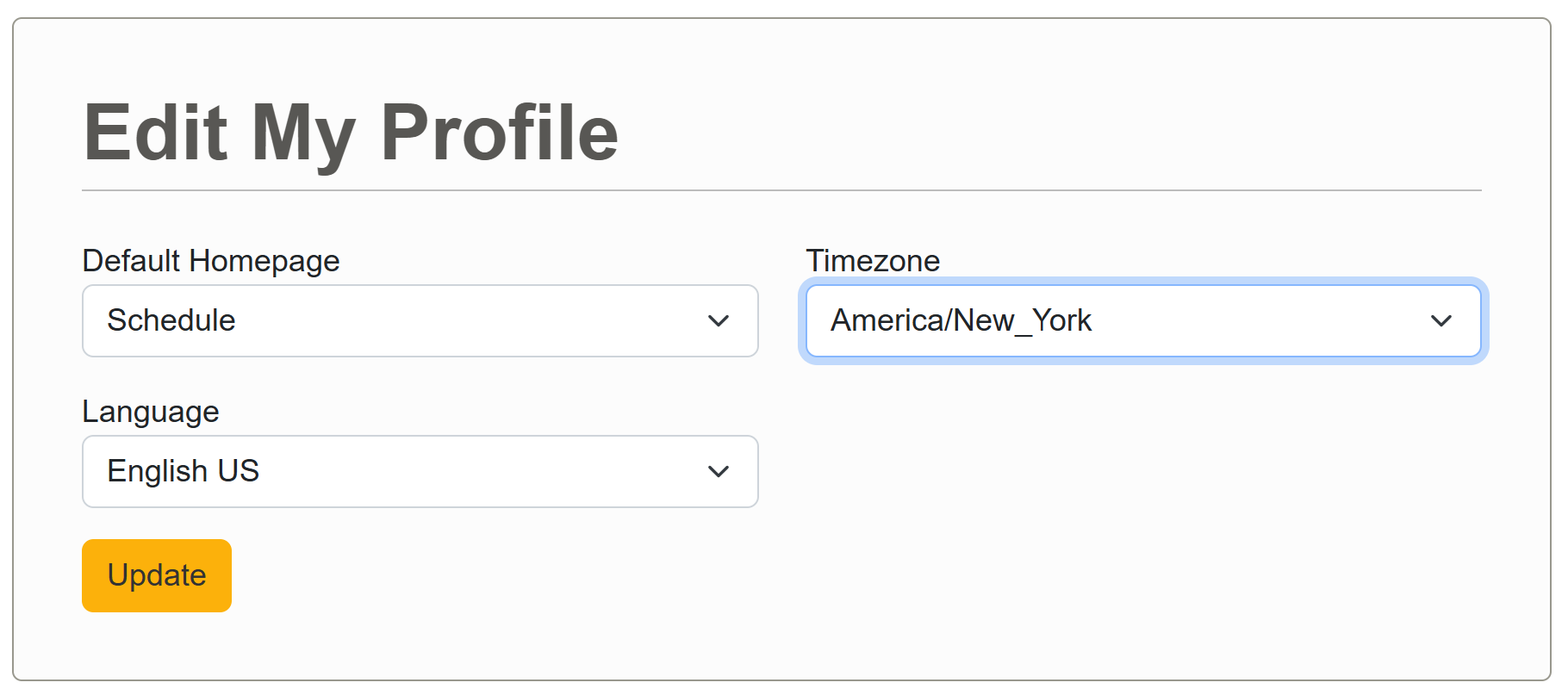 From the Profile page you have the ability to select your Default Homepage, Language and Timezone.