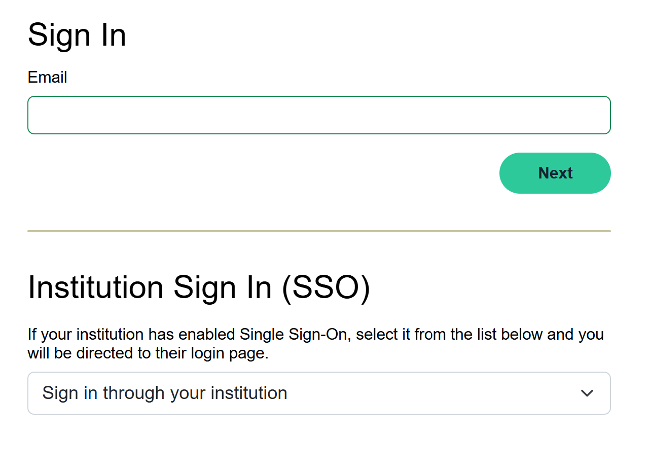 - Select your institution from the Sign in through your institution menu to be taken to your institutional Single Sign-On page.
