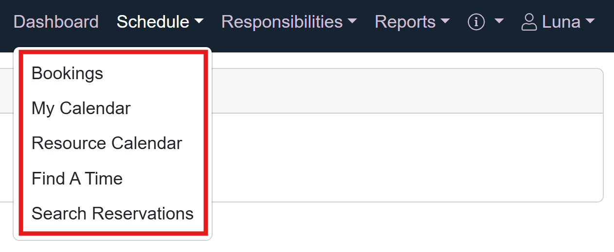 Scheduler Organization members can locate Resource availability using the options available from the Schedule menu. The Schedule menu includes personal and resource calendars, along with search and filtering options to easily identify available time slots, review existing reservations, and plan new bookings. From the Schedule menu, members can select from the Bookings page, My Calendar, Resource Calendar, Find a Time, and Search Reservations.