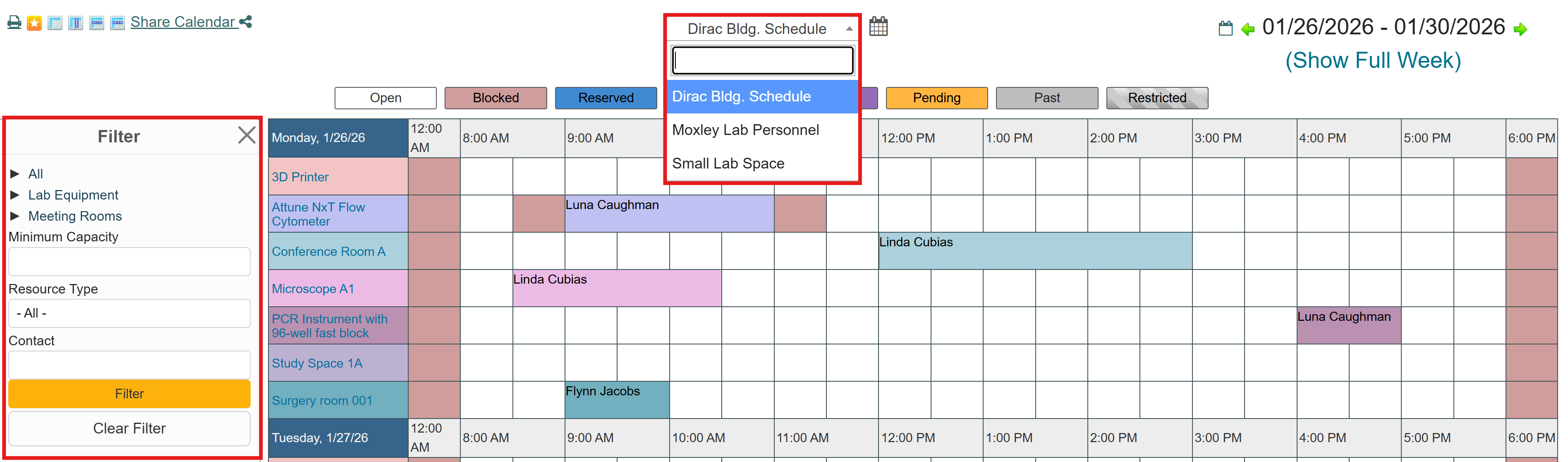 To view all reservations for a specific resource, go to Schedule and select Resource Calendar.