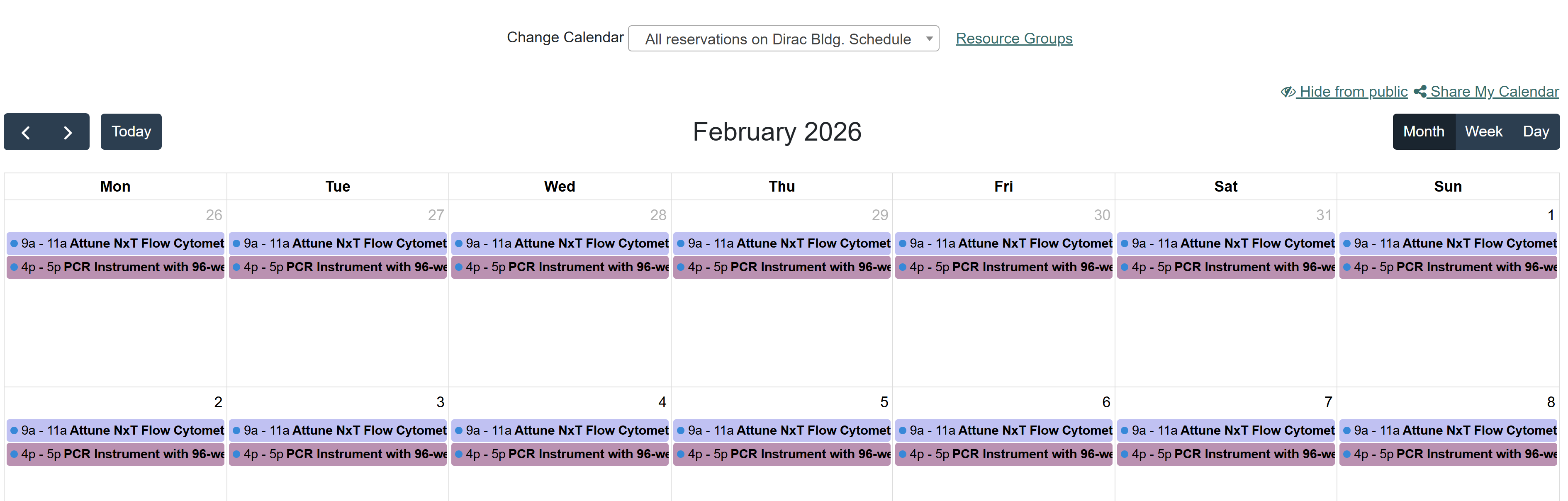 The scheduling system provides two main calendar views—My Calendar and Resource Calendar—to help you easily find and manage reservations.