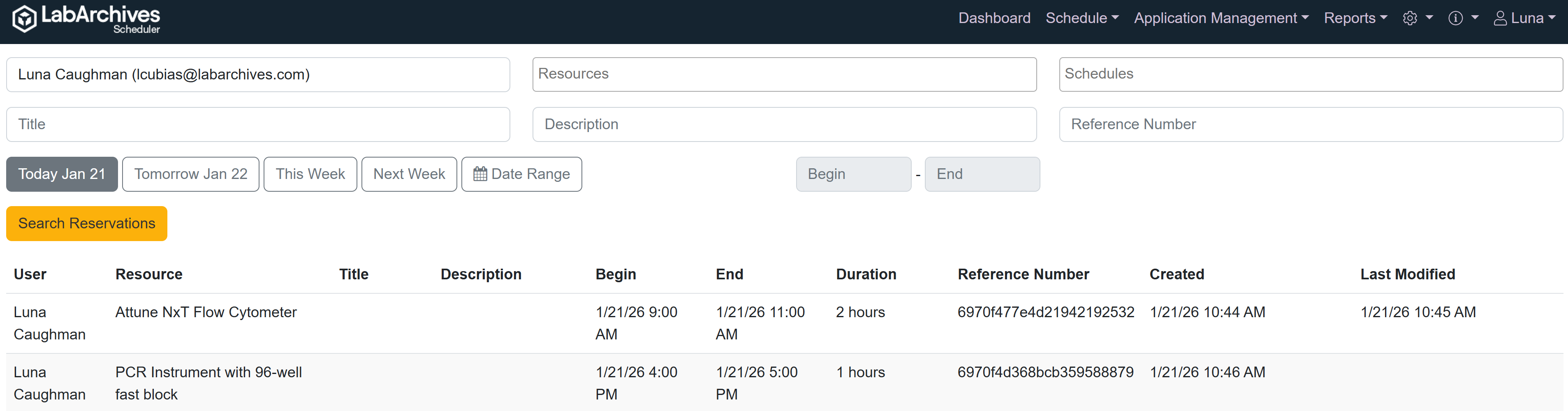 Use Search Reservations to look up existing reservations in your Organization. From the Schedule menu select Search Reservations. Use the search form to search by Resource, Schedule, Title, Description, or Reference Number.