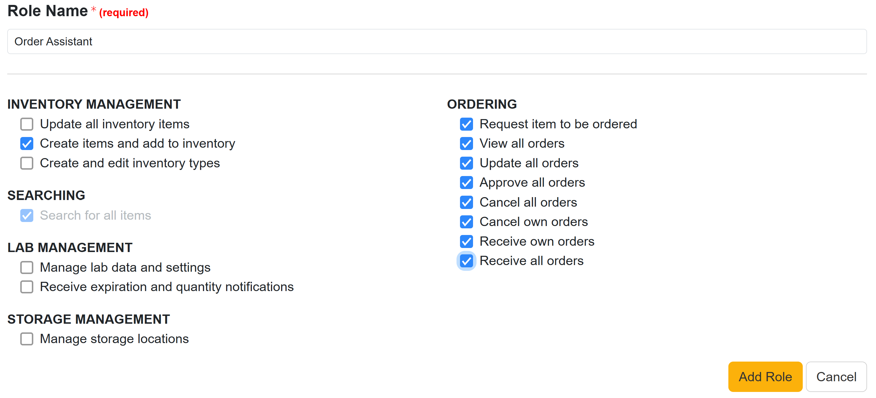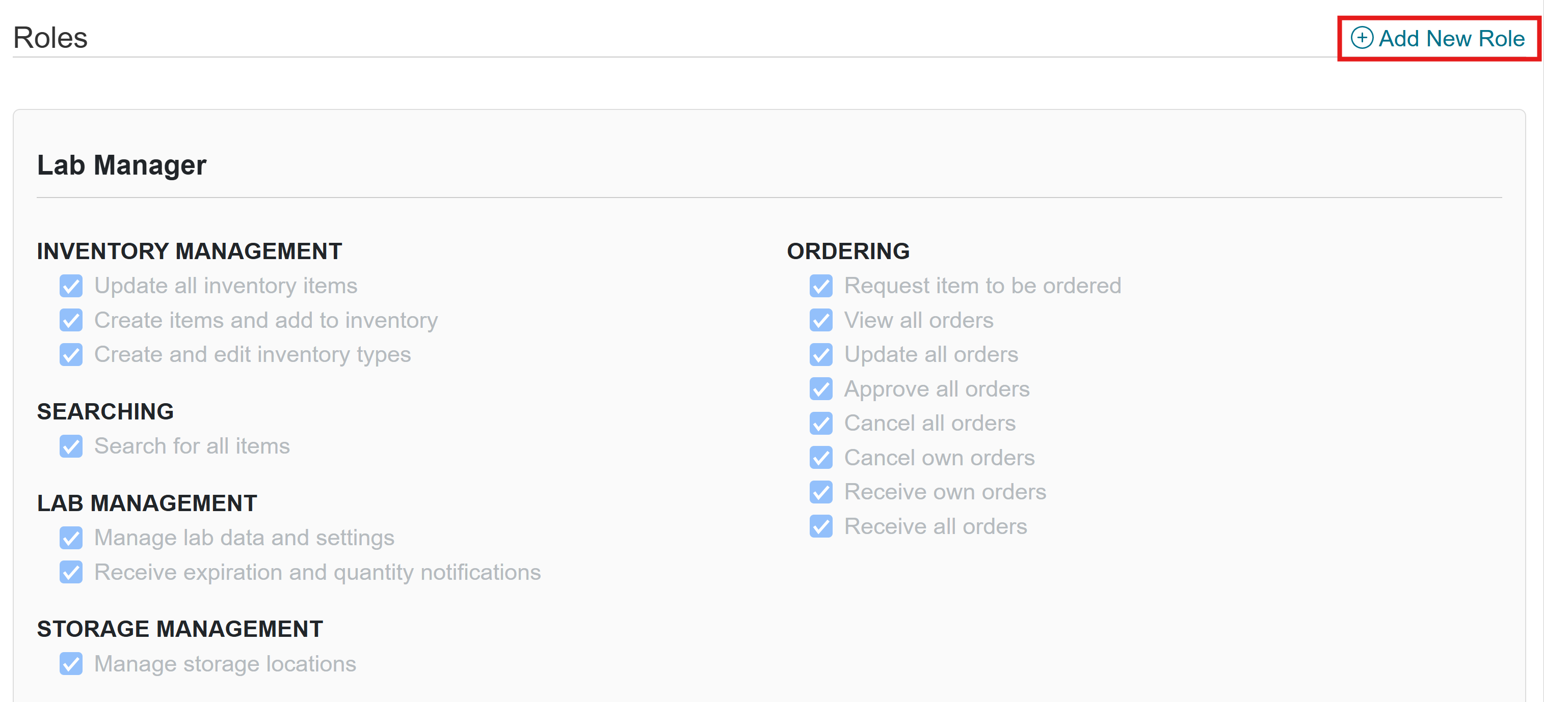 In addition to the default Lab Manager and Lab Member role in Inventory, Lab Managers or other users with access to the Lab Management function have the ability to create Custom Roles. This allows you to customize the permissions for users that may not directly line up with the predefined permissions of the default roles. For example, you can create a role for an order assistant so that you have someone on staff to help manage the order process, but does not have all the access that a Lab Manager may have. To learn more about specific roles and privileges, please visit Understanding Inventory Roles and Permissions.
