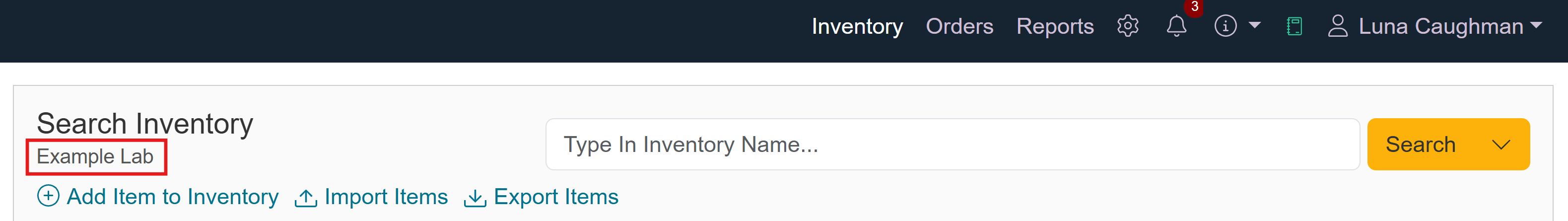 When working across multiple Labs, it is important to know which Lab you are currently viewing. The name of your active Lab is displayed prominently on both the landing page and the Inventory page, helping ensure that you are always working in the correct lab environment.