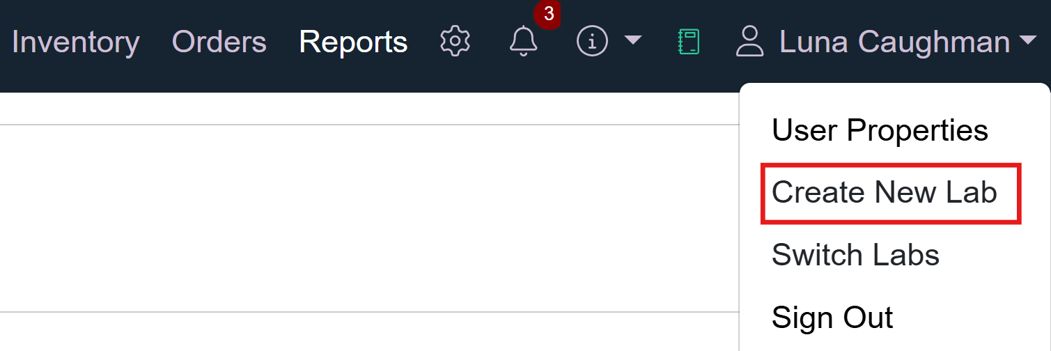 In order to be able to create new Inventory Lab, you must be assigned the Lab Manager role in an existing Lab. From the name menu, select Create New Lab. A dialog box will appear prompting you to enter a name for your new lab. Choose a clear and descriptive name (for example, based on a location, research group, or project) so it’s easy to identify later. After entering the lab name, click Confirm to complete the setup.