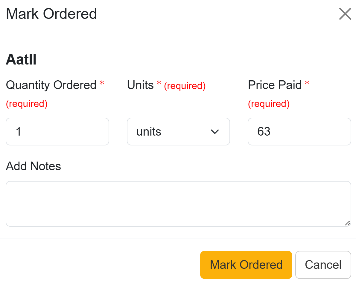 Selecting Mark Ordered displays fields to adjust the Quantity Ordered, Units, and Price Paid. Also included is a Note section where the Lab Manager can add additional information that will be visible to the requester. Click on Cancel or the X in the window to return the prior screen. This does not formally cancel the order and instead just closes the window.