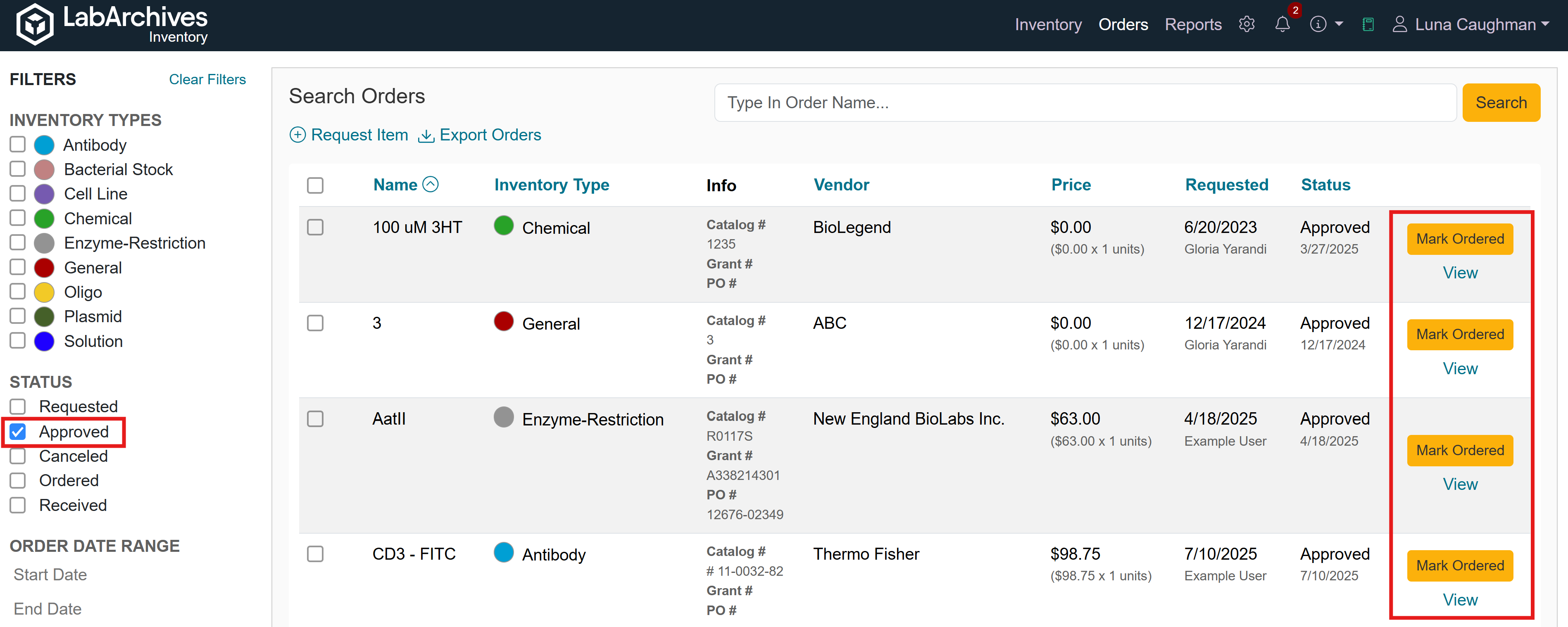 The Orders Page includes a Status filter and an option to view Approved Items. When filtering on Approved items, the items will display on the results page with an option to Mark Ordered and View the item.