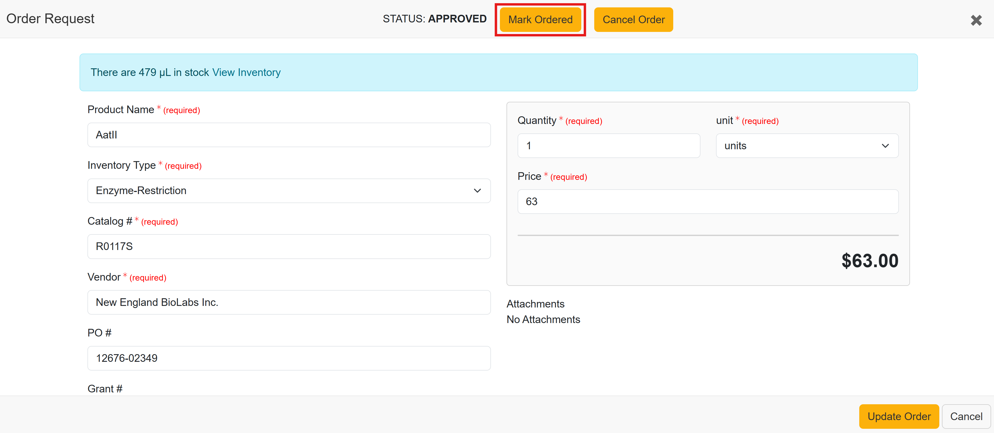 After a Lab Manager or other users with Order approval privileges have Approved an order, the Lab Manager's next step is to place the order in the local procurement system or directly through the vendor site. To keep the lab and requester updated on the order status, the Mark Ordered option can be selected to indicate that the order has been placed.