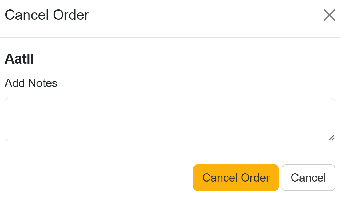 Viewing the item displays the full Order Request Form with an additional option at the top of the page to Mark Ordered or Cancel the order. Selecting either option displays the same confirmation window noted above with an option to add Notes that will be visible to the requester.